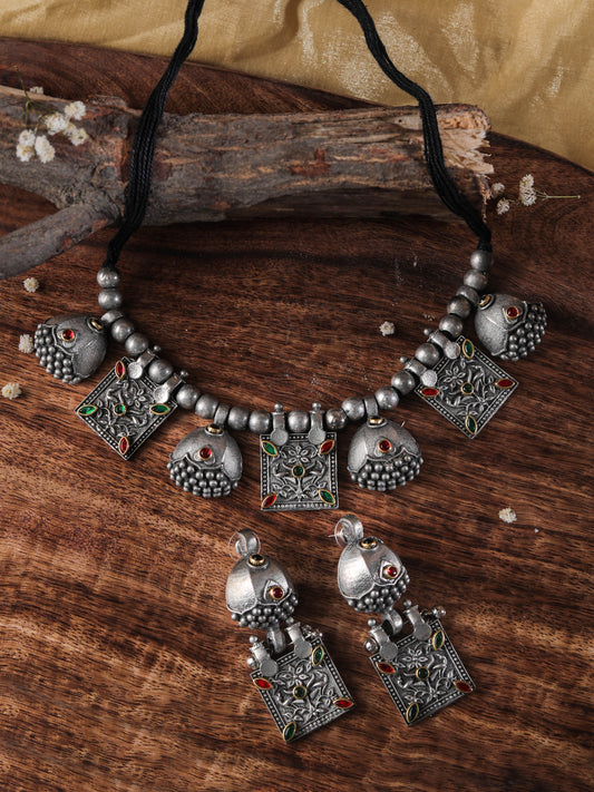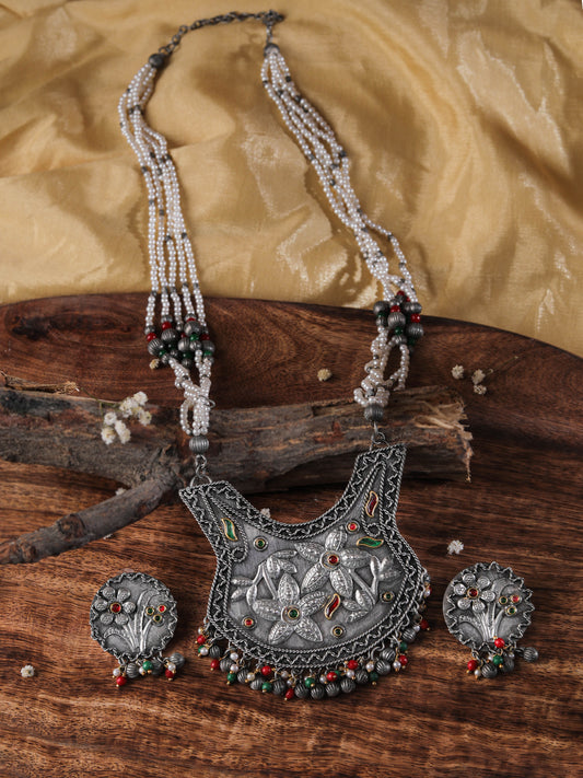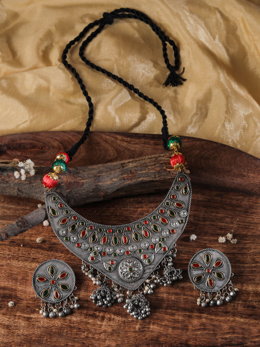 The Cranberry Ornated Stud Necklace Set in Magenta & Green