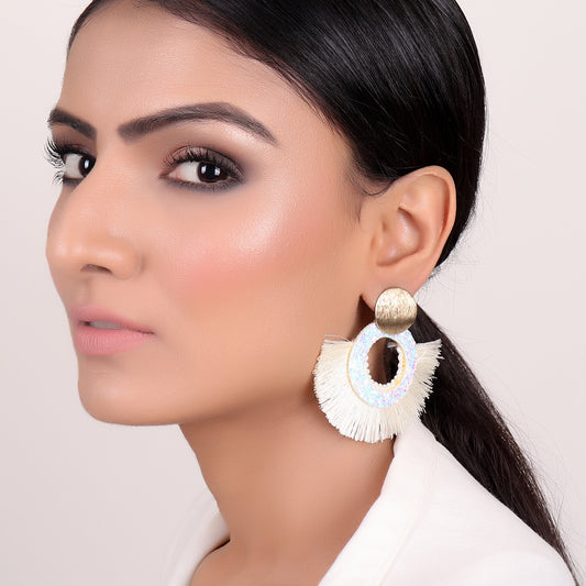 Jhoomer Earring with Rhinestones and Mirror in White & Cream
