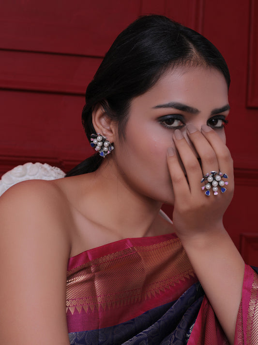 The Floral Poppy Ring and Earring Set in Blue & Pink