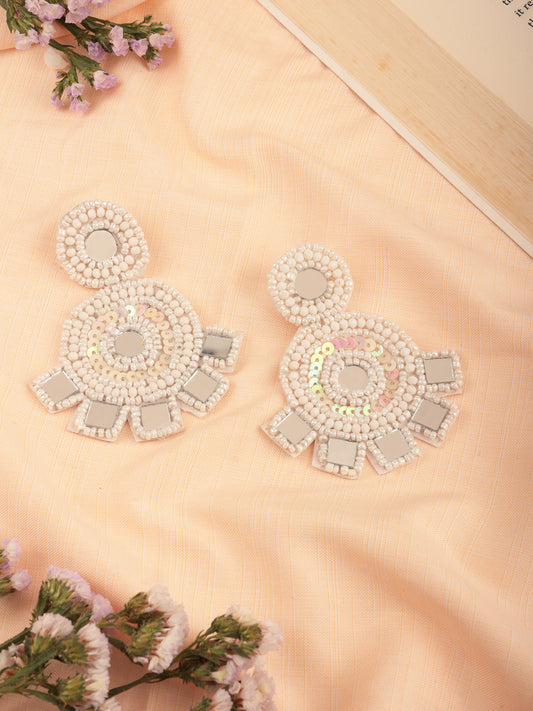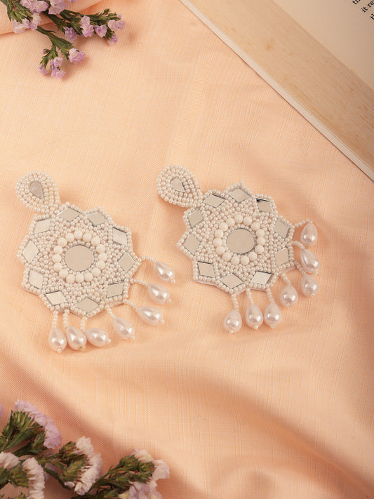 Jhoomer Earring with Rhinestones and Mirror in White & Cream