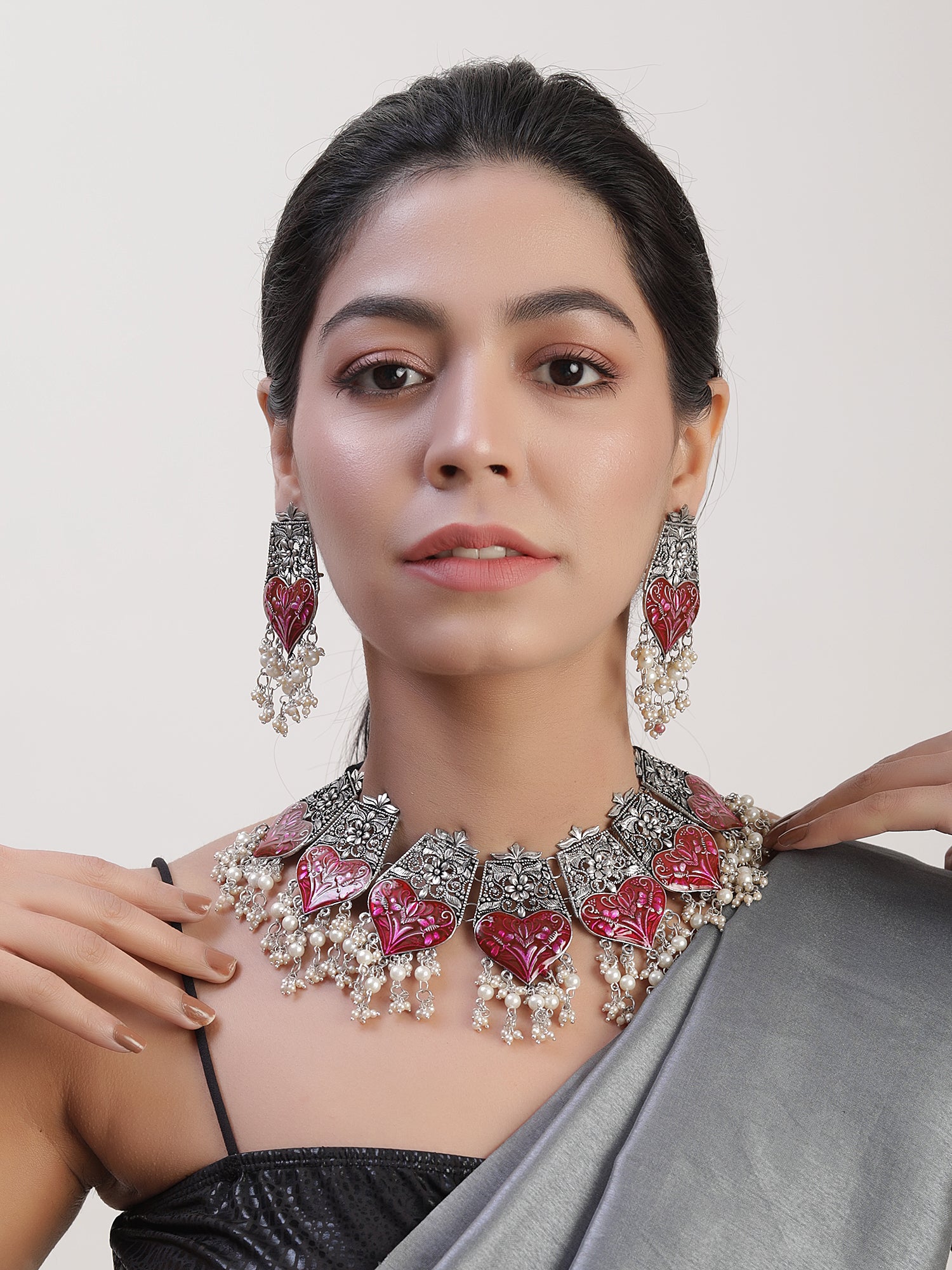 Chokers emits grace, and grace amplifies your elegance. Presenting the beautiful choker set knitted with handpicked faux pearls and colourful stones to give you the perfect look. Taking the design inspiration from Mulberry, this set comes with matching earrings and it is absolutely comfortable to wear, making it an awesome blend of beauty, charm and gorgeously designed accessory. Match it up with your ethnic or fusion looks and set the stage on fire!