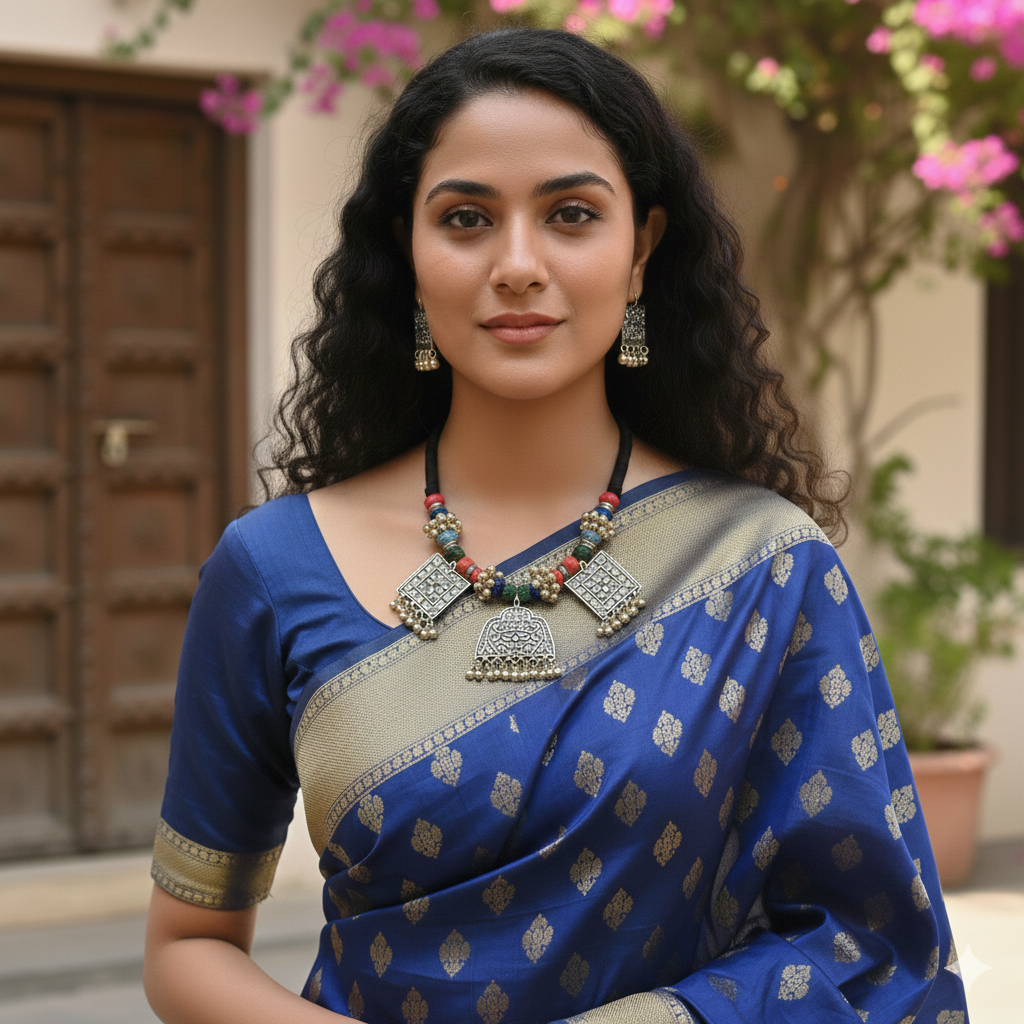 If colors makes you happy, we ensure we add the right colors into the necklace set! Cheerfulness is a character that comes from every inch of this necklace set. The multi Colored Beads is put in its place by weaving it along designer clasps, the pearl enhancers and colorful artificial pearls. The festoons or the center piece is a beautifully designed crown shaped and square shaped plates with inscription of art. The beauty is further enhanced by the small bunch of shimmers underneath. And ' To add a little more cheerfulness we add the earring as well which is designed in absolute sync of the necklace.