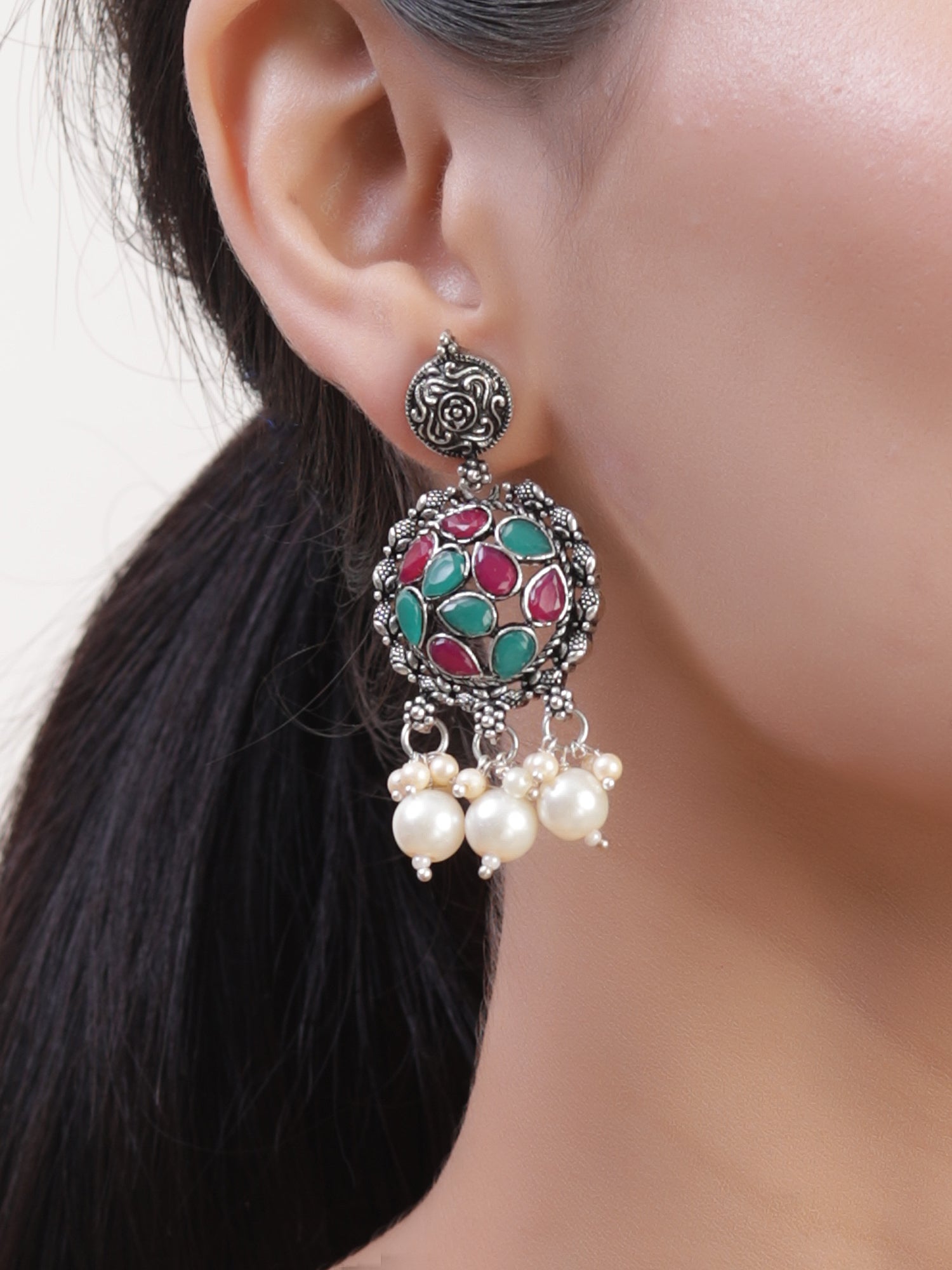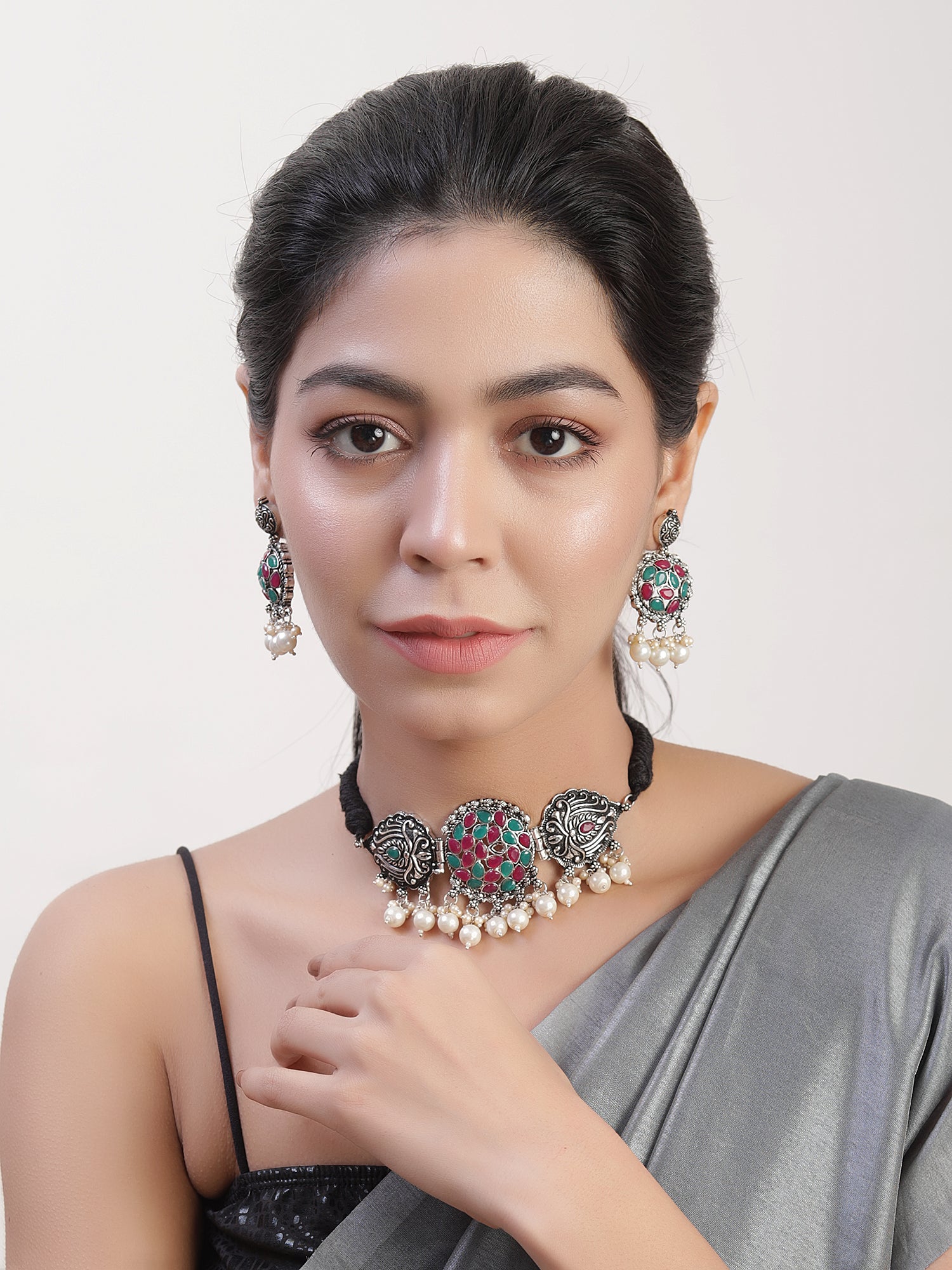 The Cranberry Ornated Stud Necklace Set in Magenta & Green