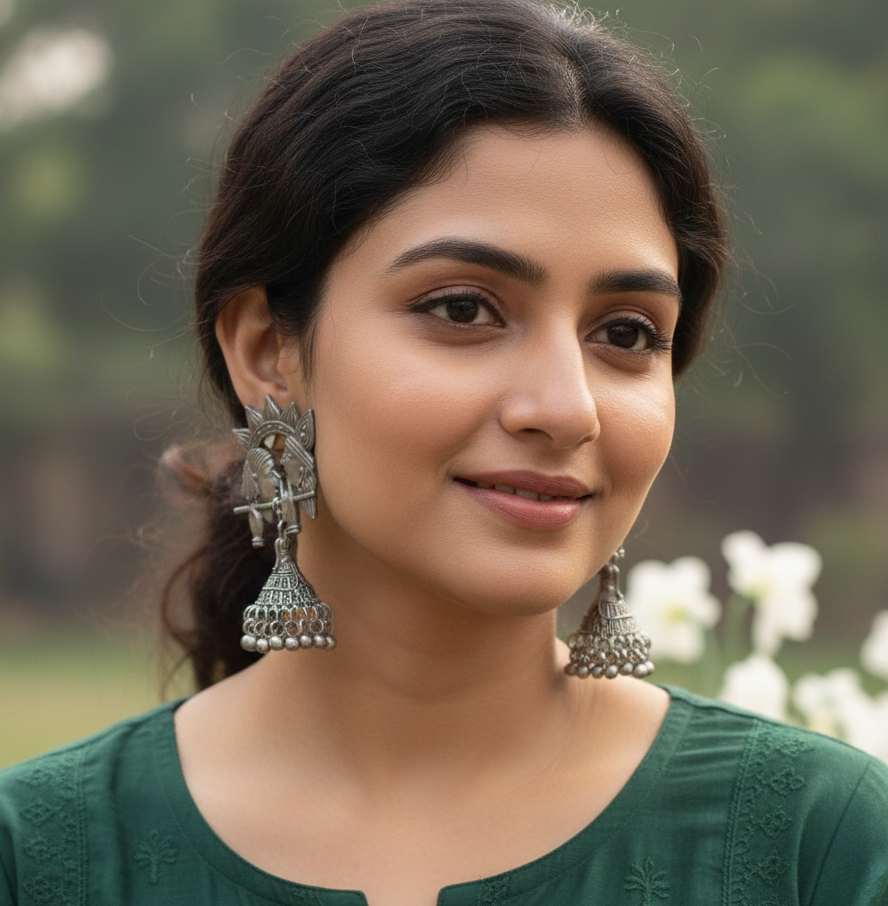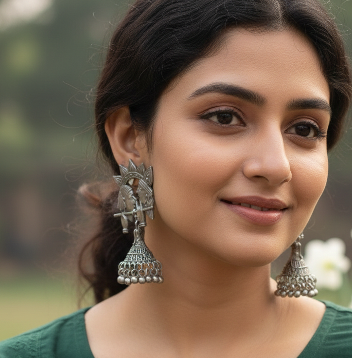 Blending in fusion of modern and ethnic inscription into an earring and yet keeping the very essence of elegance alive is this beautiful love tribe earrings. The design starts off with a medieval couple that are beautifully engraved with love. You see a gorgeous arch over them and a beautiful jhoomar below it. Each element has metallic inscriptions carved out beautifully to give it a look of grace and style.Ā This is truly graceful and beautiful. Get your hands on it fast as they are extremely comfortable to wear and definitely has a style statement of its own.